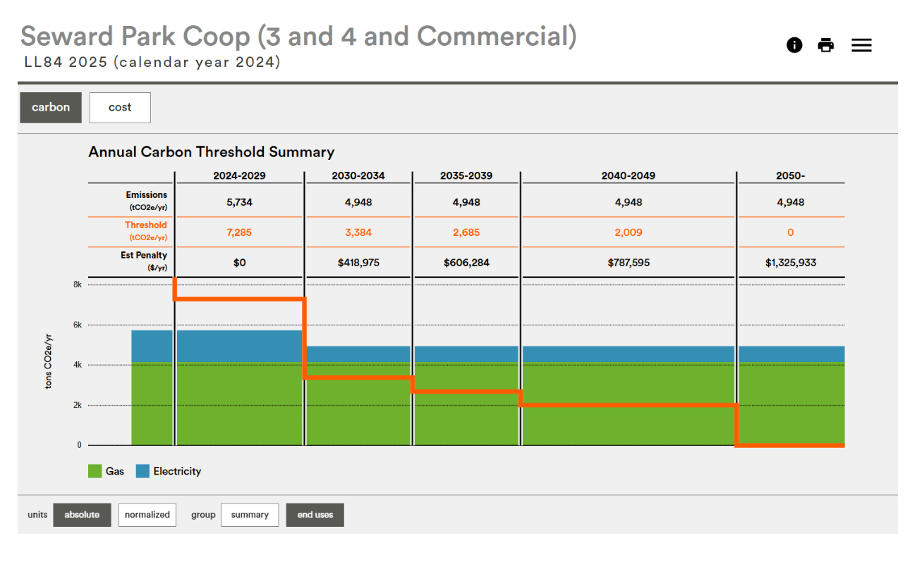 The law requires compliance for individual buildings over 25,000 square feet, and for groups of buildings under a single ownership with an area over 50,000 square feet (like our co-op). It establishes a cap for GHG emissions for different uses (in our case, housing, retail, office, and parking) and targets reductions of 40% by 2030 and net zero carbon emissions by 2050. It also establishes a penalty of $268 for each ton of carbon emissions over the limit. (This doesn’t sound like much per ton, but we’ll explain later how that can really add up!)